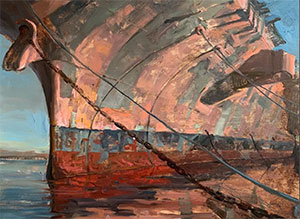 This painting is entitled USS JFK. I can picture this huge hull of a boat along the river in Philly. I love the reflections she has captured on the water, the composition and the colors she chose. Even though this painting is relatively small (12×9 inches), it feels vast!