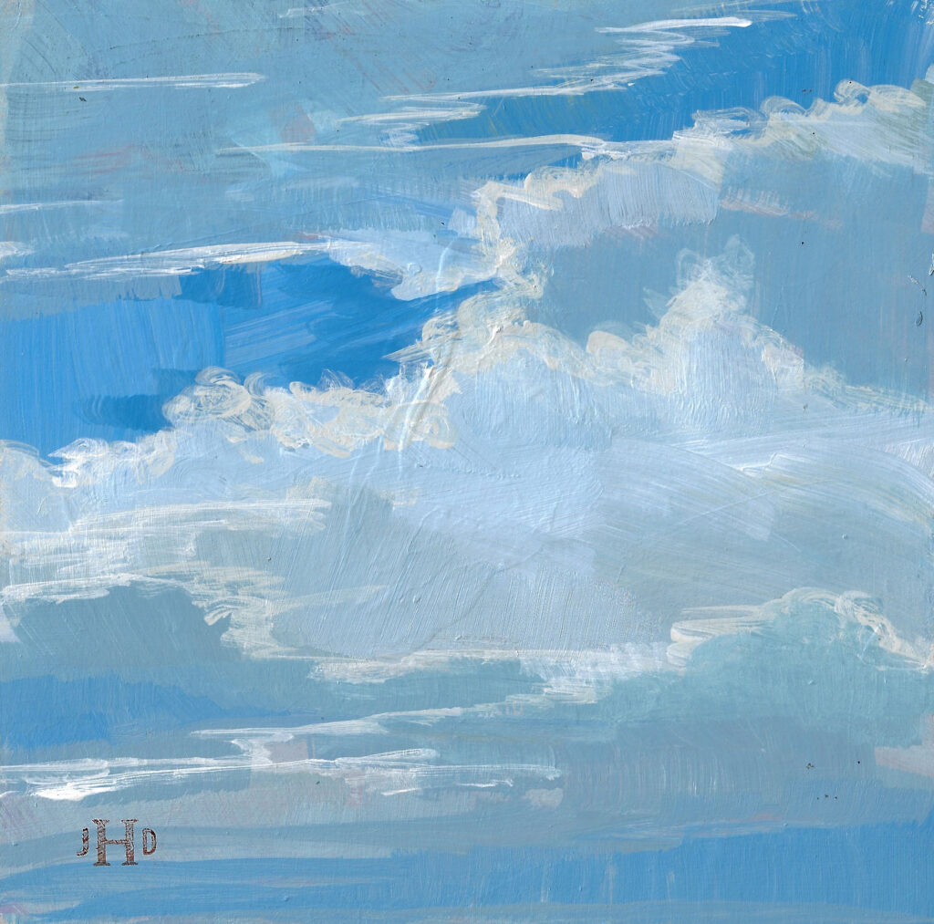 When life, news gets crazy (pretty much all the time these days, right?), I love looking up and seeing clouds. Why? Maybe because they are so beautiful, changing and, yes, calming. During a recent trip to MA I looked up and saw these clouds. This painting is 6×6 inches, painted in acrylics. Here it is: