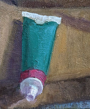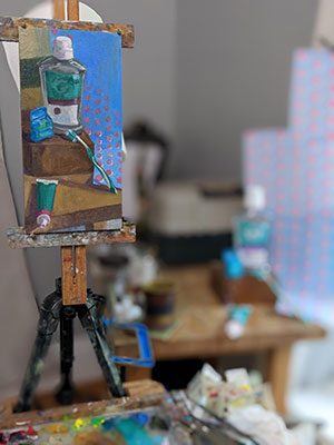 Can I get distracted or what? So let’s get back to this work in progress painting. OK? I have realized that ever since I painted this painting late last year, I love incorporating patterns into my still life paintings. So as I worked on this 2023 still life painting, I searched for ways to incorporate pattern. And, that purple dot on the Tom’s Mouthwash label inspired me to include a polka dot pattern on the right side of the painting. Why? Because I can?