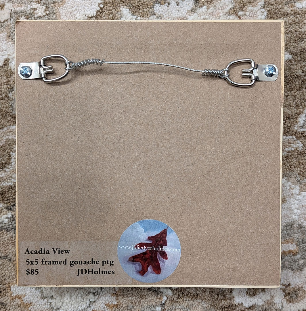 “Acadia VIew” is a small but sweet view of Acadia Maine. It’s a 5×5 inch gouache painting and framed, ready to hang. For more details including the spot in Maine where I painted this on location, check out the blog post here. Enjoy!