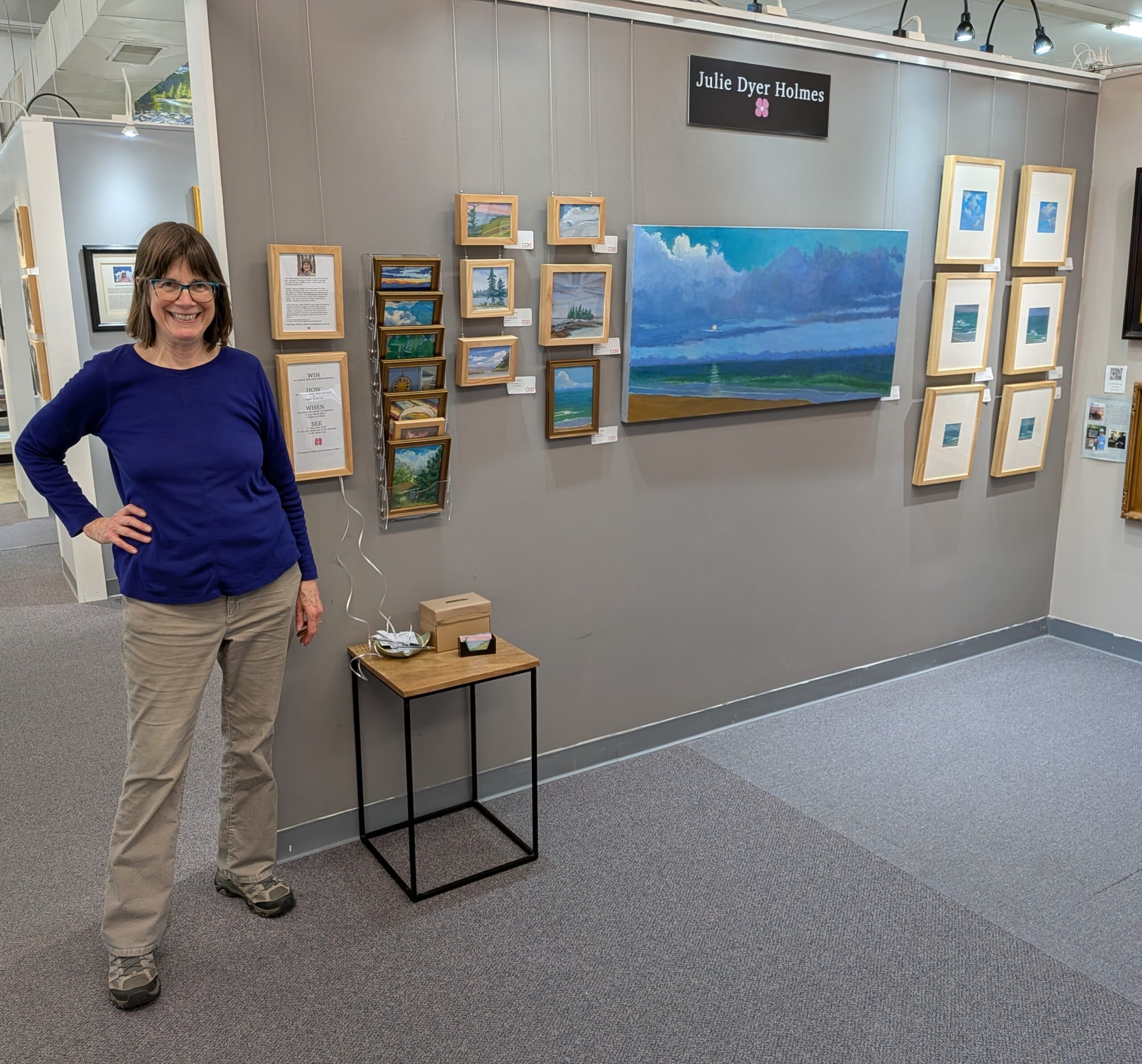 “Moonrise” invites the viewer to stand at the edge of a quiet sandy beach. A wonderful two foot by four foot creation painted in oils. It evokes that moment when you realize you’ve reached the shore.